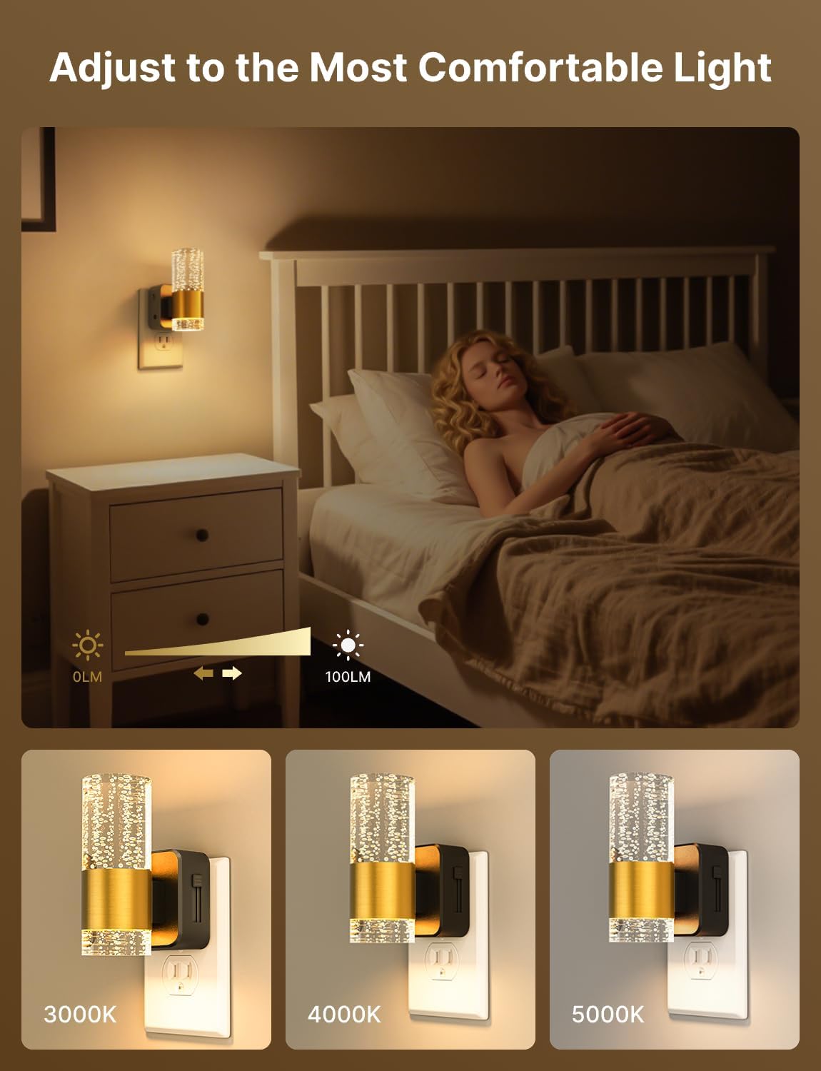 Slide the side dimmer to fine-tune the light level — soft enough for sleep, bright enough for safety.