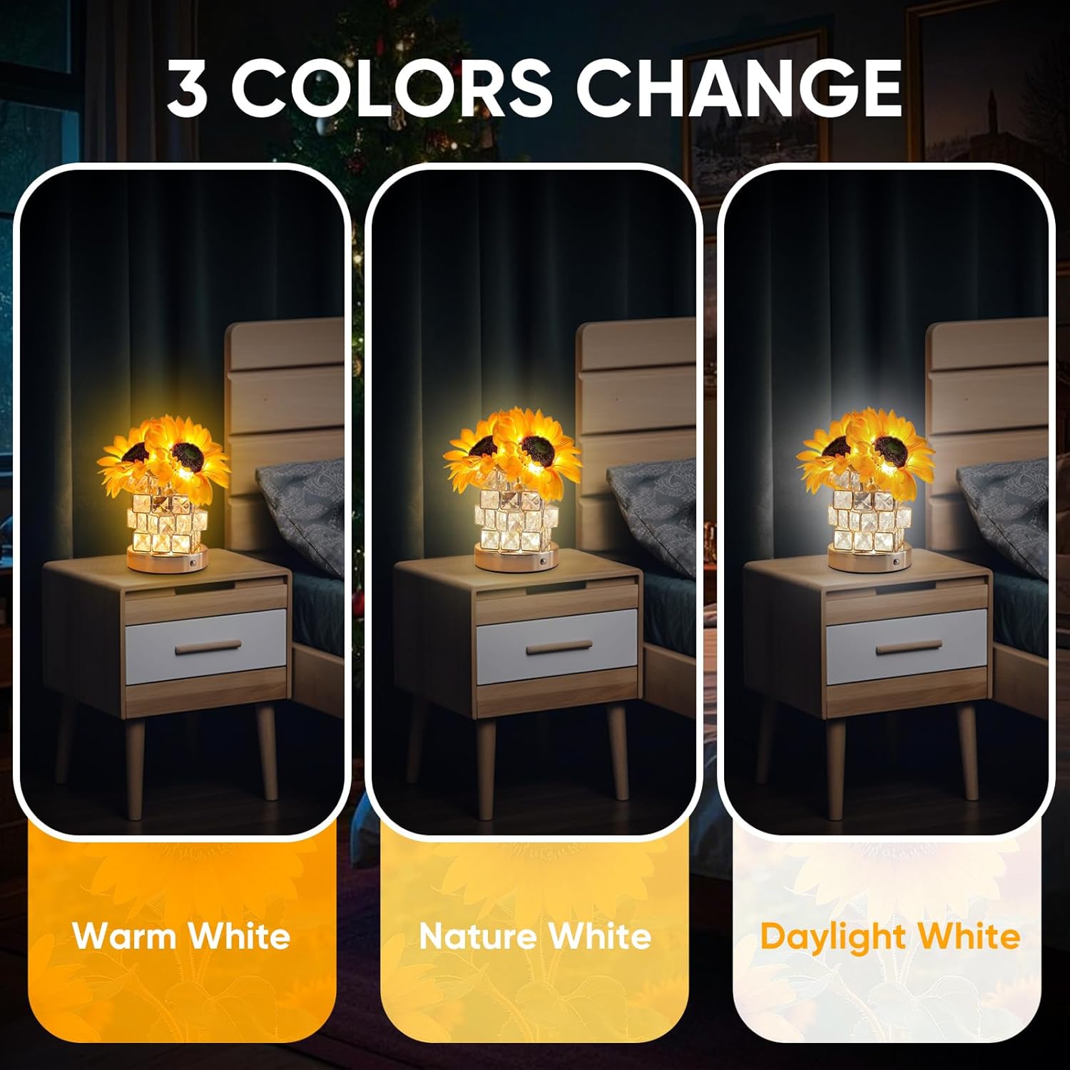 - 【3-Mode & Dimmable 】Touch controls design allow you to turn the light on/off and switch between white light, warm light, or natural light . You can long-press to adjust the brightness to your desired level. At night, it serves as a reading light, nursery light, or outdoor table lamp with soft, non-glaring light. During the day, the sparkling crystal and realistic sunflower make it a perfect potted home decoration