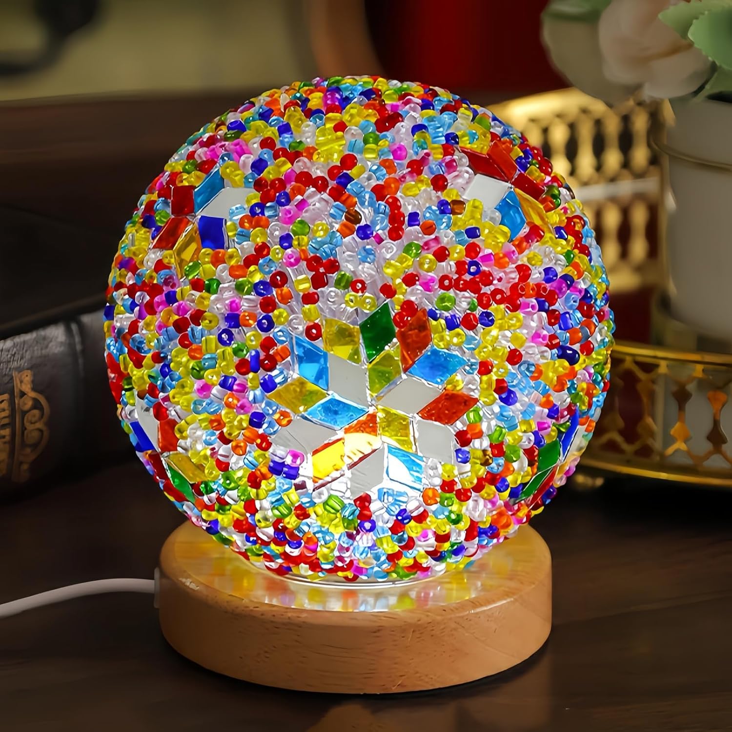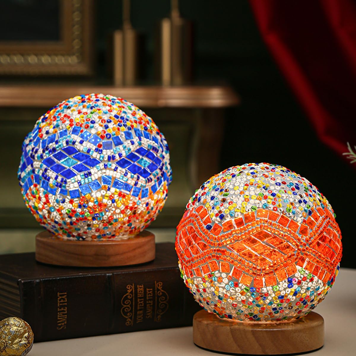 Turkish Table lamp (D:4.7" x H:5.2"),Mosaic Glass Lamps with Wooden Base, Bohemian Tiffany Bedside Lamps, USB charging Moroccan Lantern for Living Room Halloween Decorations